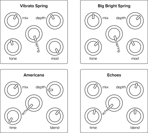 A physical spring reverb uses metal springs suspended between transducers and produces a distinctive “twerp.” The Mod knob increases the modulation rate — try increasing the modulation rate for a classic vibrato-spring reverb sound.